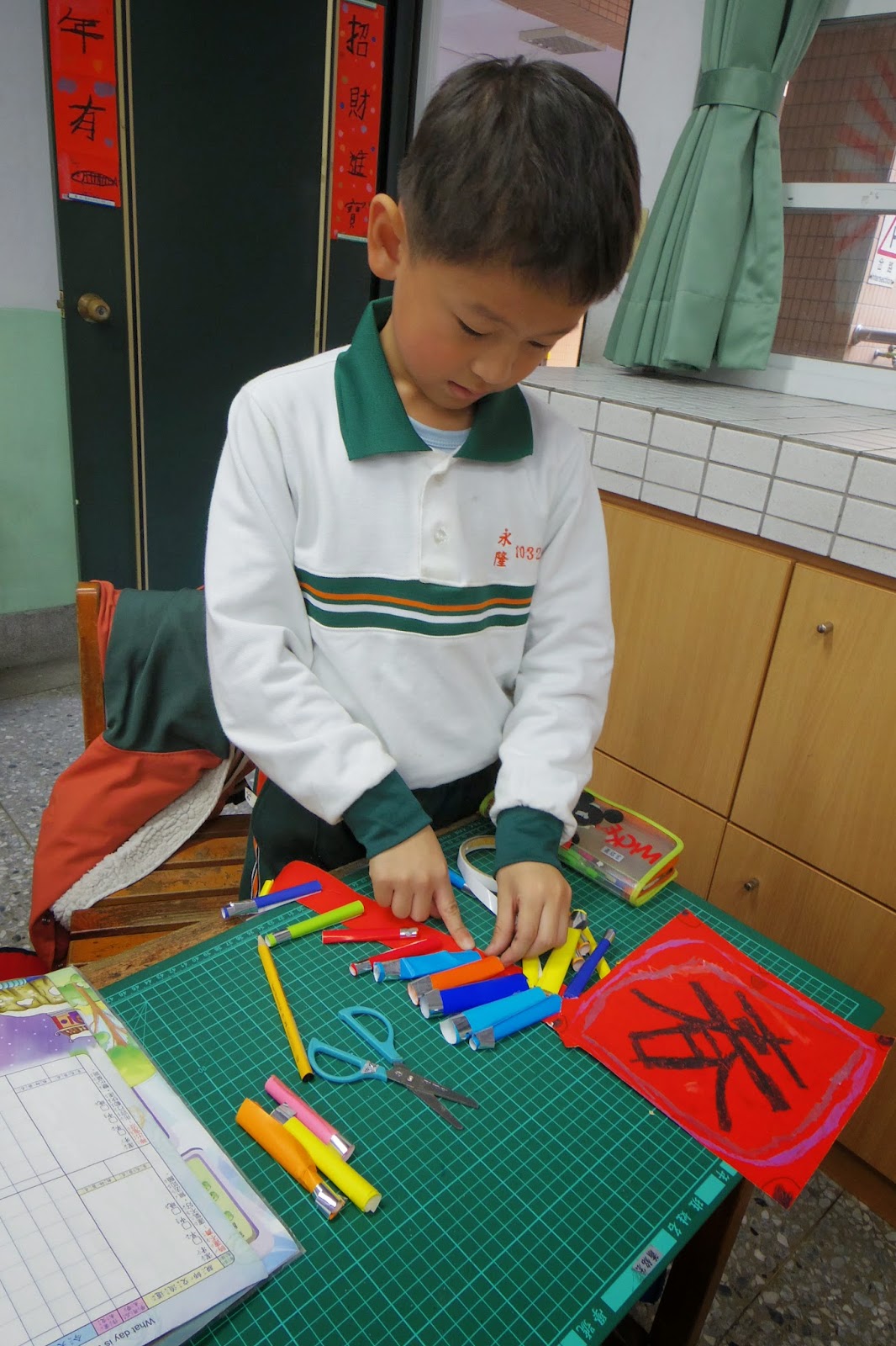 之後還得利用色紙捲上鞭炮,並用亮彩膠帶滾邊裝飾